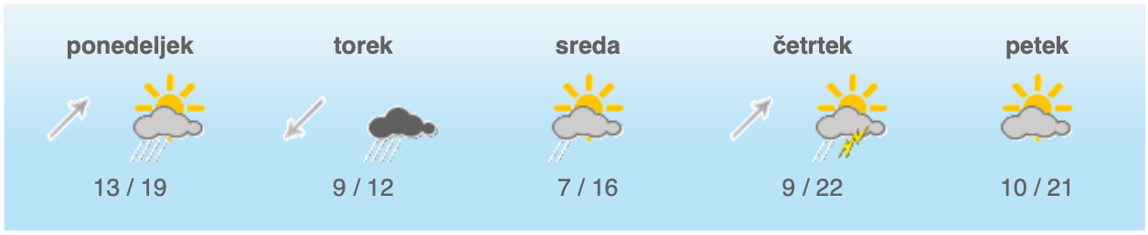 Na vzhodu bodo tudi sončna obdobja. Pihal bo okrepljen jugozahodni veter, ob morju jugo. Najvišje dnevne temperature bodo od 15 do 23 stopinj Celzija.