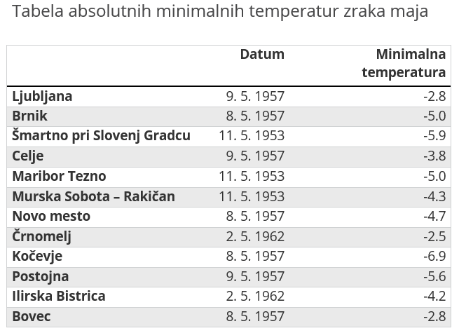 Rekordne minimalne temperature v mesecu maju leta 1953 v Šmartnem pri Slovenj Gradcu, v Mariboru in v Murski Soboti, leta 1957 v Ljubljani, na Brniku, v Celju, Novem mestu, Kočevju, Postojni in Bovcu, leta 1962 pa v Črnomlju in Ilirski Bistrici. Od takrat je minilo že več kot 50 let.
