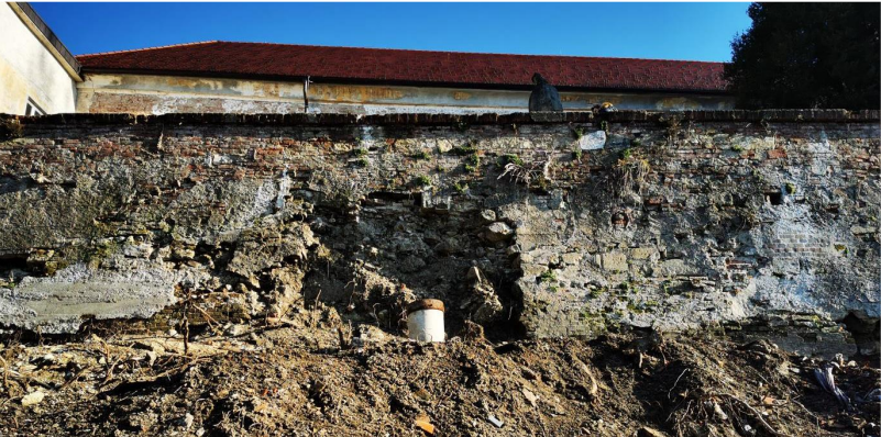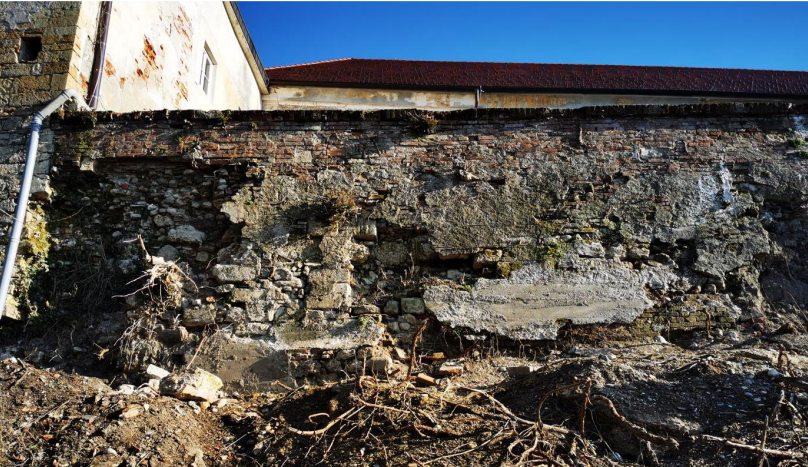 Stanje je takšno, da je zid statično neustrezen, pojavlja se izpadanje in degradacija osnovnih gradnikov, fuge so močno poškodovane, krušijo se gradniki, opaziti je moč deformiranje in nagibanje zidu, krona zidu iz opeke je močno poškodovana in degradirana, sanacija je bila na več mestih neustrezno izvedena, zid je poraščen z vegetacijo, v dni je moč opaziti spodjedanje.