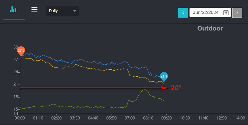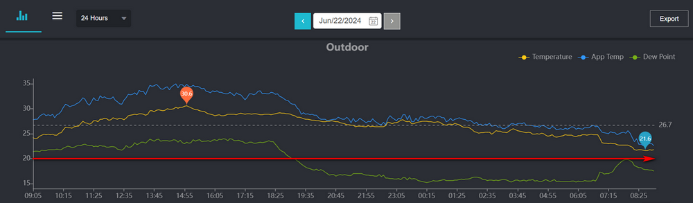 Ob polnoči je bila temperatura še 27,5 stopinj Celzija. Tekom včerajšnjega dne se je temperatura povzpela preko 30 stopinj Celzija na 30,6 stopinj Celzija.