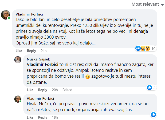 »Preko 1250 slikarjev iz Slovenije in tujine je prineslo svoja dela na Ptuj. Kot kaže, letos tega ne bo več, ni denarja, pravijo, nimajo 3800 evrov. Oprosti jim 'bože', saj ne vedo, kaj delajo,« je zapisal.