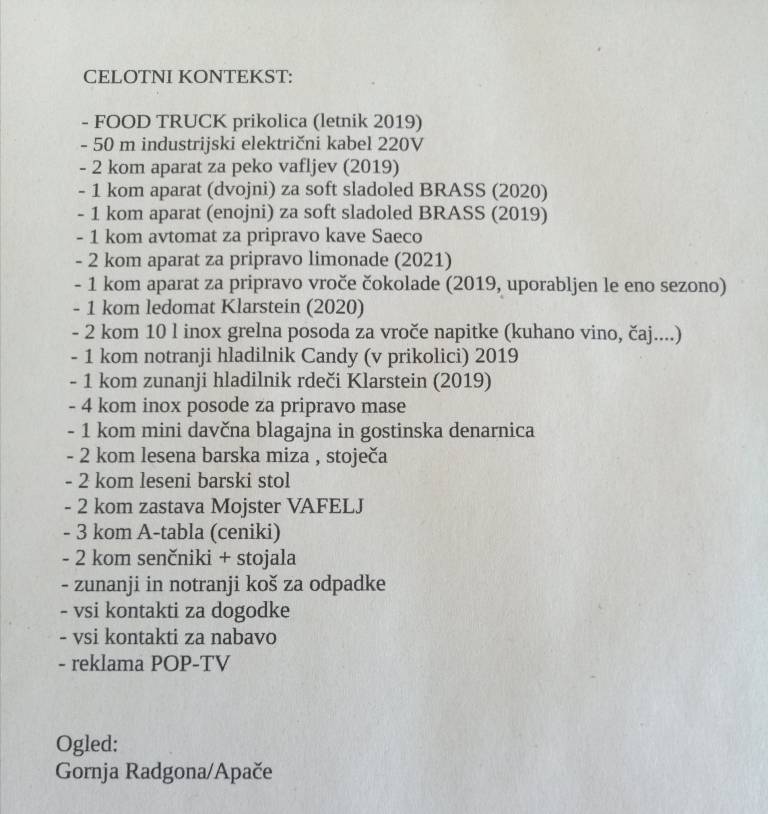 Prodajamo prikolico z vso opremo, koncept, ime in naučimo vas, kako delati, saj imamo s tem ogromno izkušenj. Čeprav je materialna vrednost v prikolici in opremi, pa so ravno koncept, know-how in ime tisti, ki so izjemnega pomena, da lahko z delom pričnete takoj.