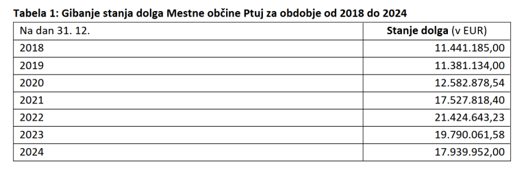 Mestna občina Ptuj je svoj največji dolg v višini 21.424.643,23 evra imela imela takoj po začetku drugega mandata županje Nuške Gajšek. Dva tedna po njeni izvolitvi je namreč pri banki najela dolg v višini 5 milijonov evrov, ki se je pridružil bančnemu kreditu najetemu konec 2021 v višini 5,5 milijona evrov in še dvema bančnima kreditoma iz leta 2020, v višini 2 milijona evrov oziroma 6,1 milijona evrov. Leta 2019 je občina sicer najela še bančni kredit v višini 1,3 milijona evrov.