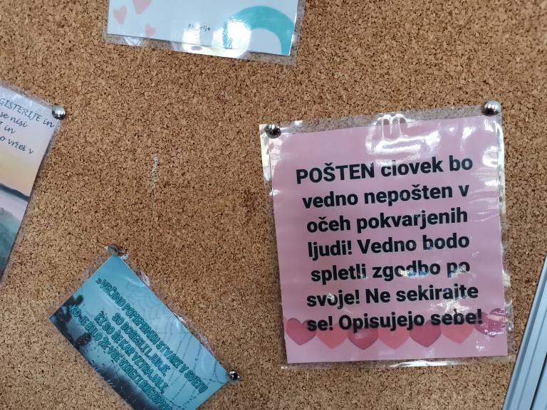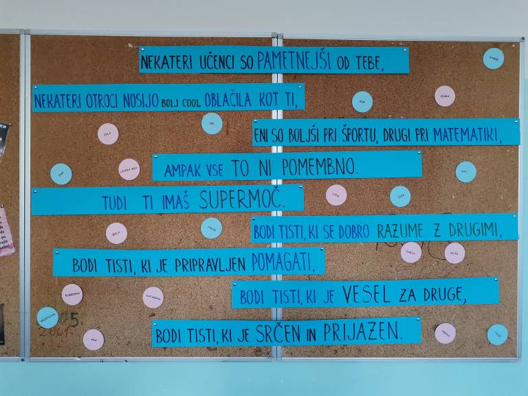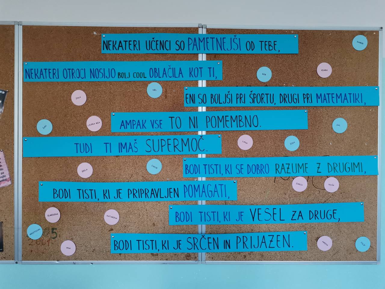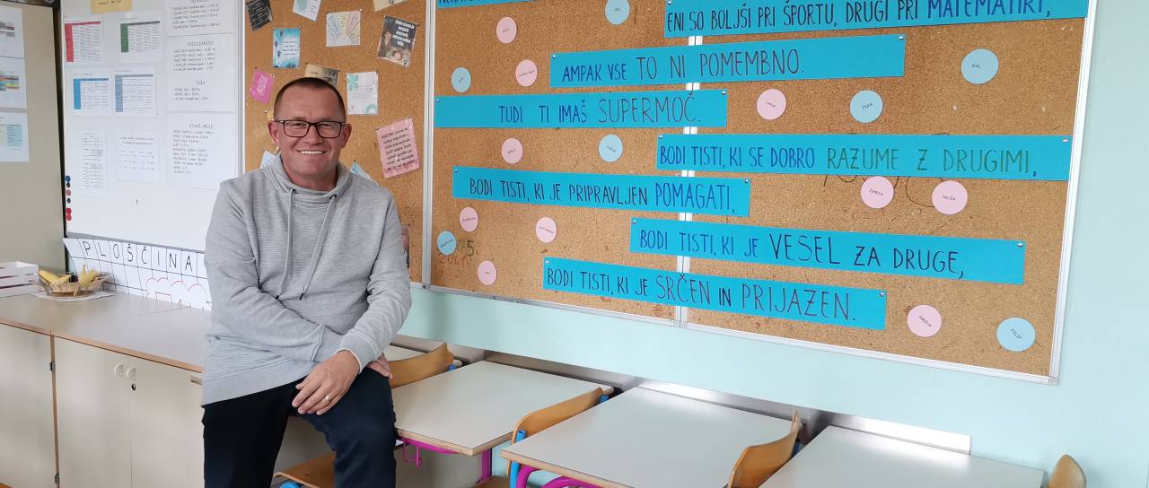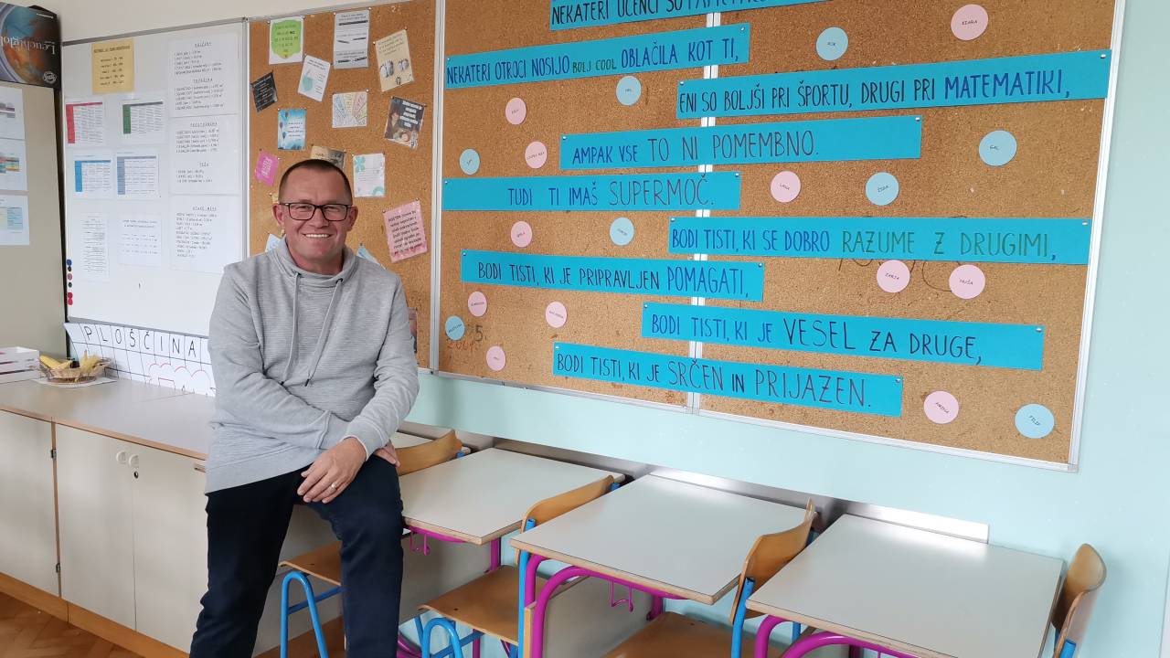 A posebno navdihujoče je opremljena tabla, ki učence vsak dan opomni na najpomembnejšo stvar. Ne ulomki, formule ali geometrijski liki. »Bodi tisti, ki je srčen in prijazen,« je vodilo, ki ga otrokom želi predati naj učitelj.