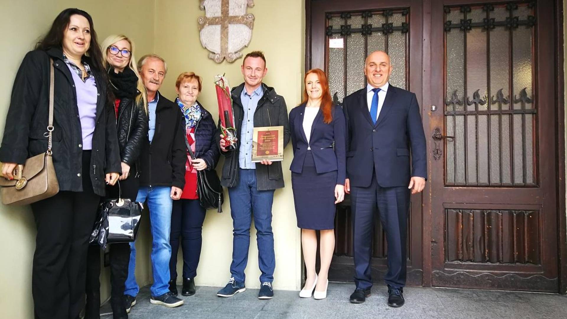 Župan Mestne občine Ptuj Miran Senčar je danes sprejel mladega ptujskega kamnoseka, ki je iz slovenskega apnenca izdelal grb Mestne občine Ptuj in ga podaril mestu. Grb je nameščen na steni veže pred vhodom v mestno hišo.