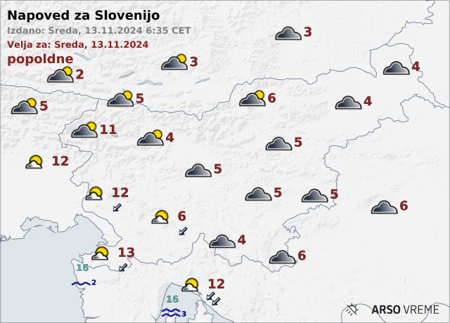 Danes bo sprva povsod oblačno. Čez dan se bo v severni in zahodni Sloveniji deloma zjasnilo, drugod pa bo še vztrajala nizka oblačnost, ki se bo počasi trgala, napovedujejo vremenoslovci Agencije za okolje. Na Primorskem bo dopoldne pihala večinoma zmerna burja, ki bo popoldne postopno slabela.
