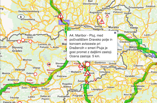 Daljši zastoj, po ocenah prometnoinformacijskega centra dolg okoli pet kilometrov, je nastal na podravski avtocesti med priključkom Hajdina in razcepom Draženci. Zastoj se nadaljuje po glavni cesti mimo Podlehnika do mejnega prehoda Gruškovje.