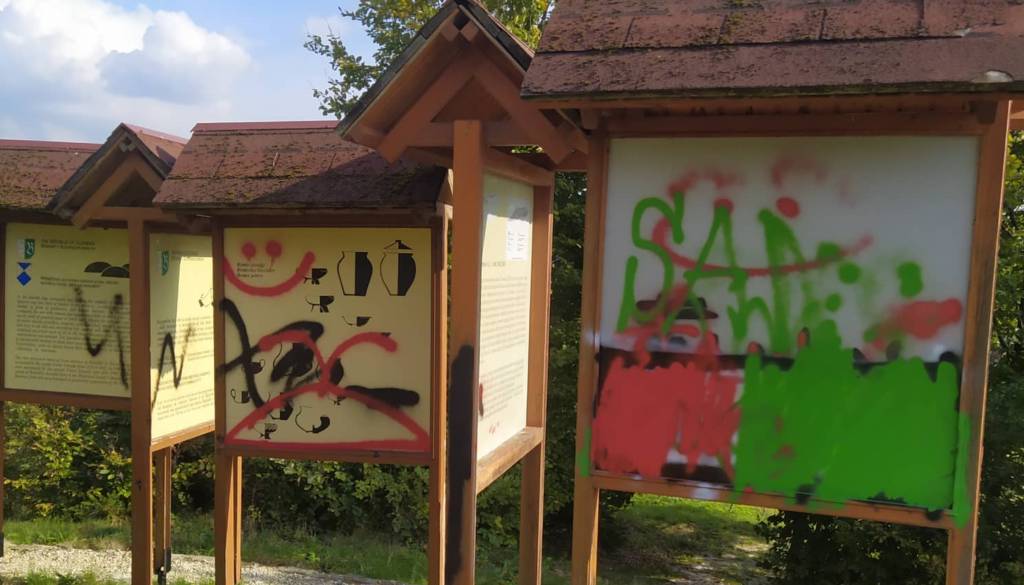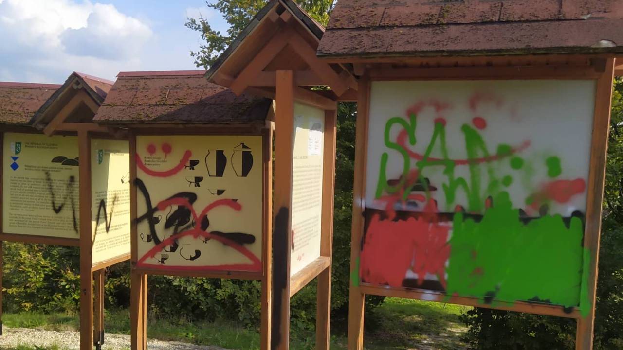Z grafiti so povzročili večjo škodo na spomenikih. Privoščili so si risanje grafitov na spominskem obeležju Rimskega gomilnega grobišča ter na pripadajočih informativnih tablah.
