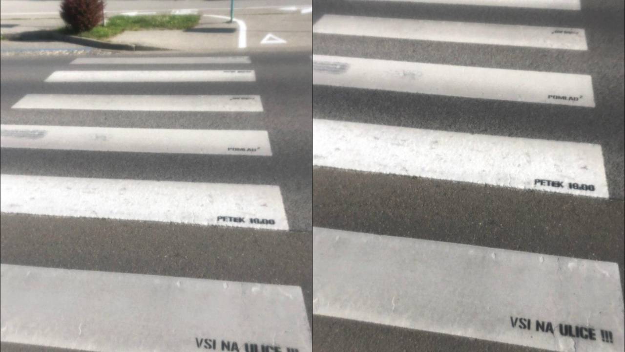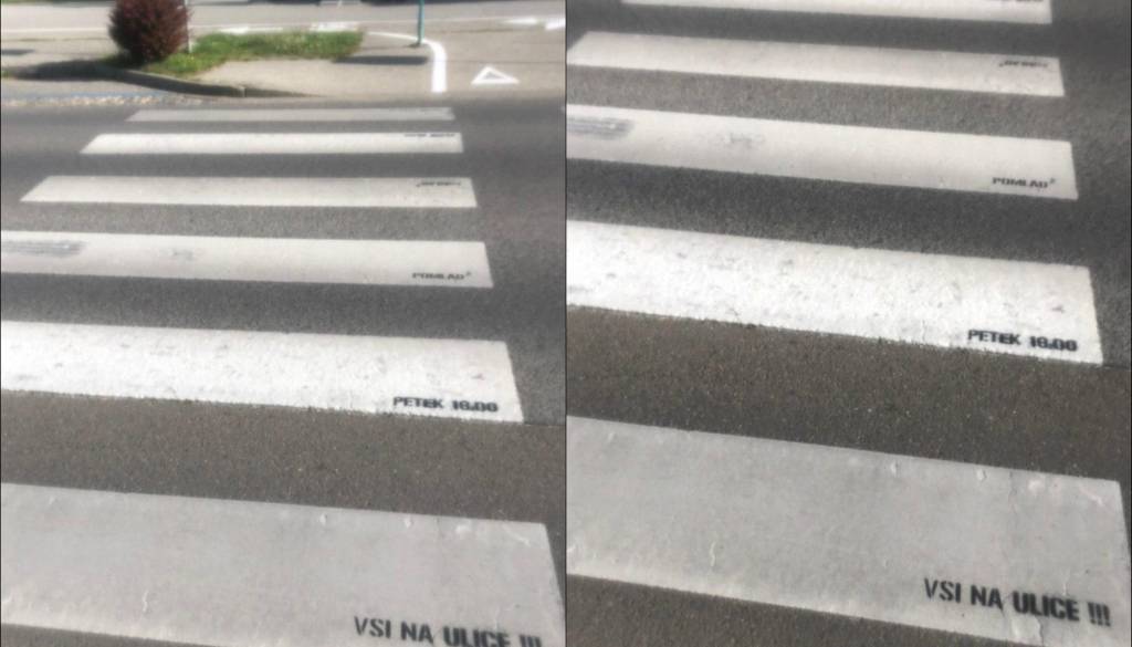 V Murski Soboti pa nekdo na svojevrsten način poziva ljudi na ulice. Na prehodu za pešce je namreč zapisano »Pomlad na kvadrat«, »Petek 18.00« in »Vsi na ulice!!!«.