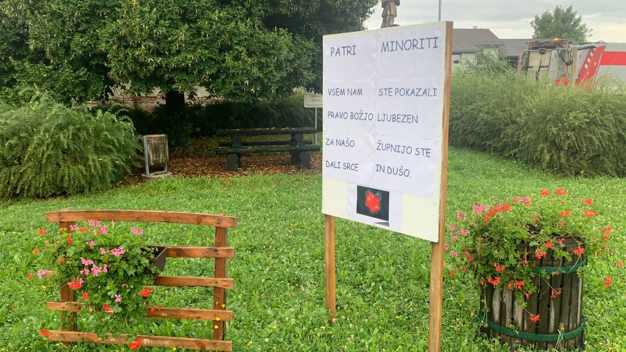 »Dragi patri Minoriti, za vaše delo in trud v naši župniji, za vašo sočutnost in posluh poslušati nas smo vam v zahvalo na panojih v vasi Turnišče izkazali kanček naše hvaležnosti.