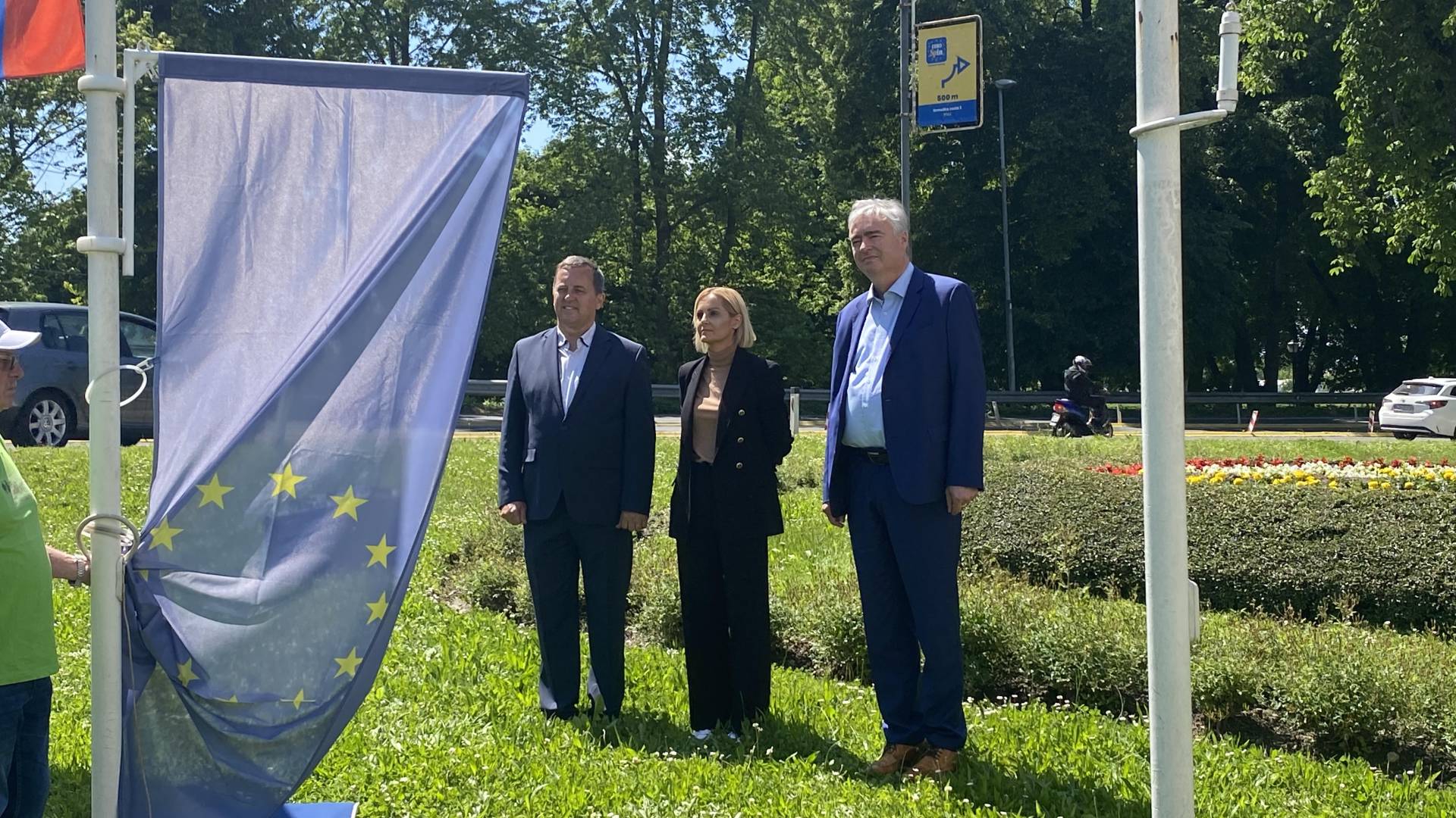 Ob 12.30 so se vsi zbrani odpravili izpred mestne hiše proti ptujskem Evroparku, kjer sta županja Nuška Gajšek in predsednik Turističnega društva Ptuj Peter Pribožič v spremljavi odigrane himne izobesila zastavo Evropske unije.