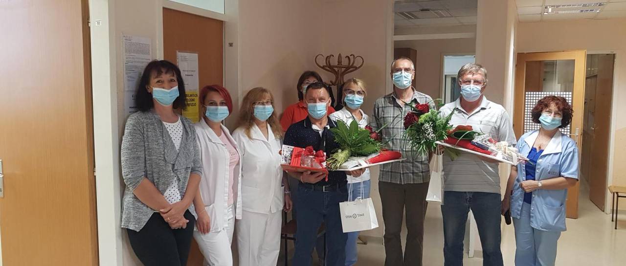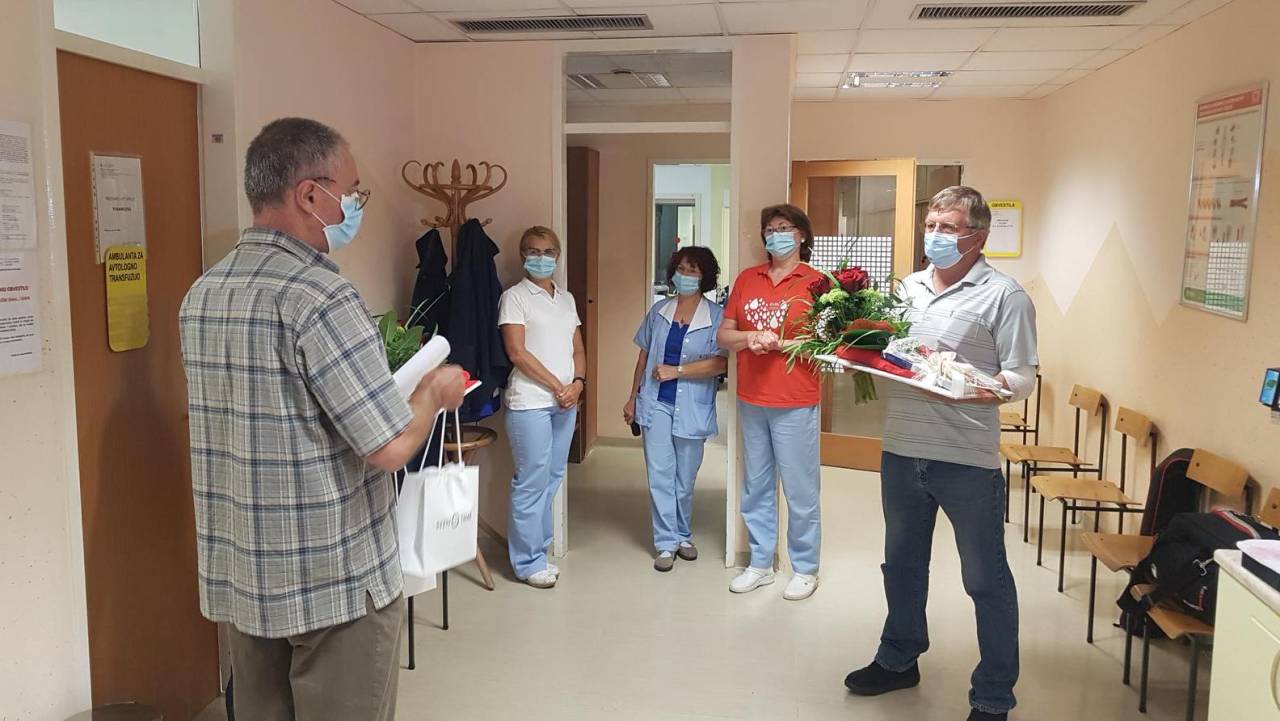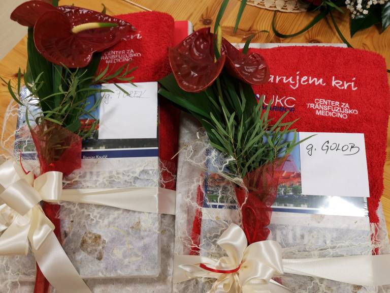 Vodja Enote za transfuzijsko dejavnost Ptuj Božislava Majcen Vivod z zdravstvenim osebjem se je stokratnima darovalcema krvi za to plemenito dejanje zahvalila z darilom.