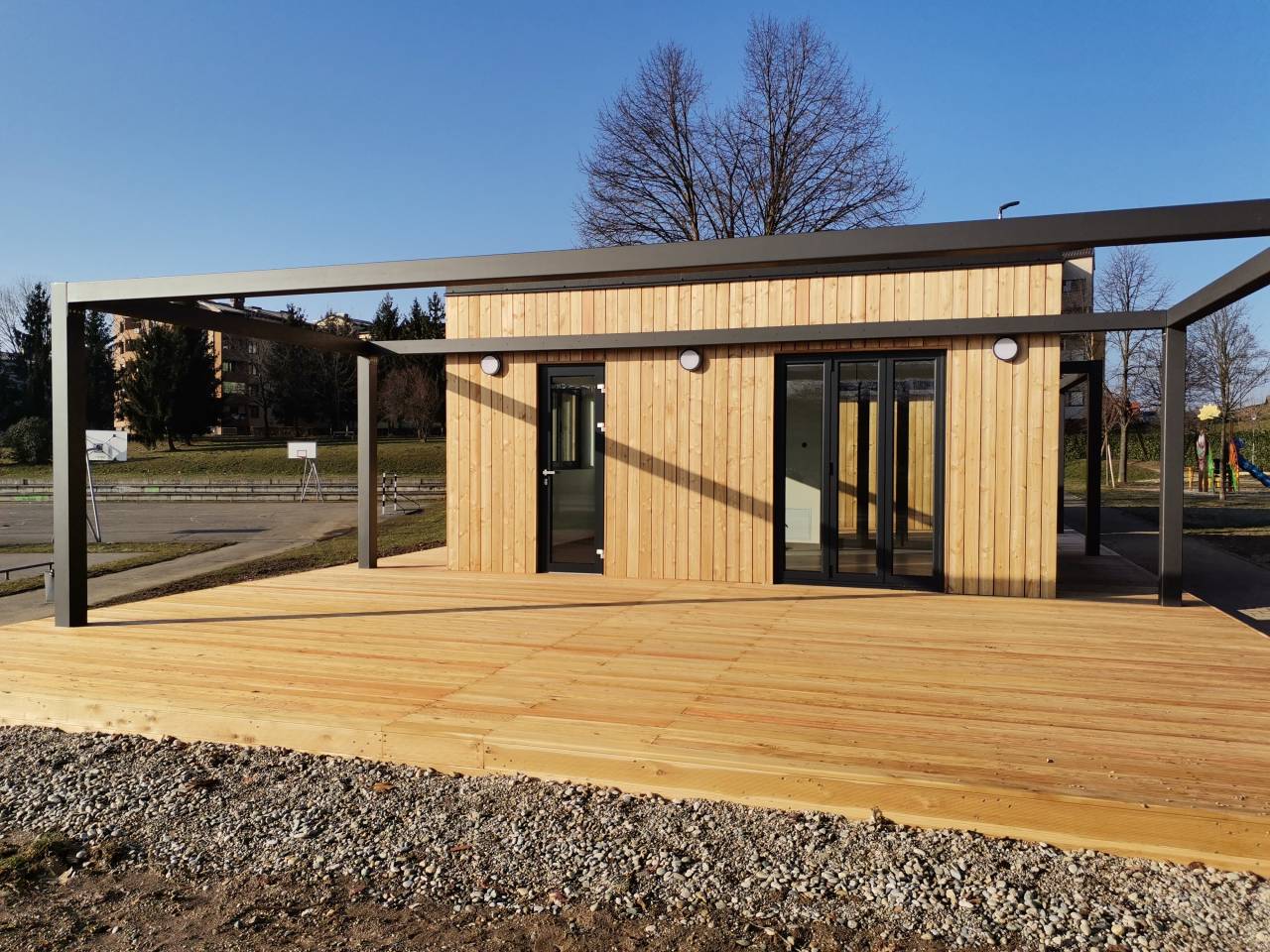 Postavljena sta dva objekta z leseno teraso. S tem si je občina želela obogatiti nabor dejavnosti na tem območju. Obenem pa so vzpostavili tudi dostop do javnih sanitarij, ki so bile v parku potrebne.