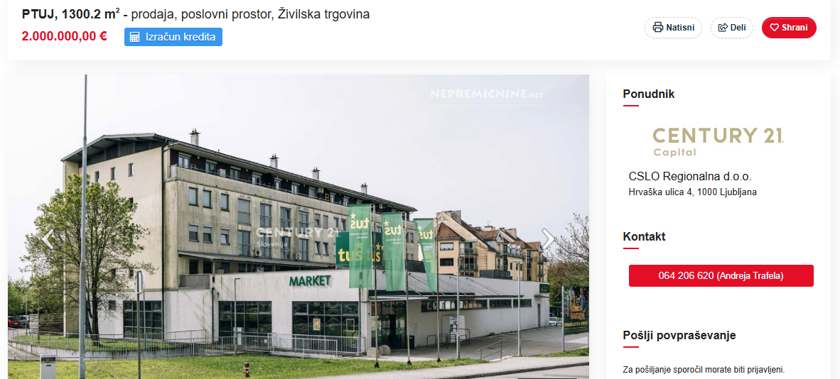 Na naslovu Osojnikova cesta 27 na Ptuju je na prodaj poslovni prostor, kjer deluje Tuševa trgovina. Objekt v pritličju obsega trgovski prostor s pripadajočimi skladiščnimi in pomožnimi prostori. Po podatkih iz Katastra stavb znaša neto tlorisna površina 1300,2 kvadratnega metra.