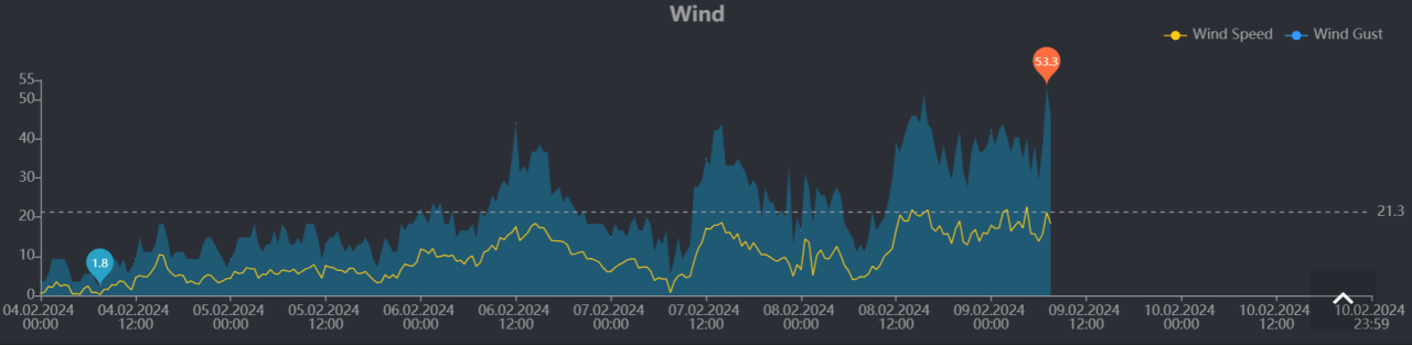 Včeraj, 8. februarja, ob 15.40 je bil podoben sunek z 51,5 kilometri na uro (oziroma 14,3 metra na sekundo) in predvčerajšnjim ob 14.15 s 43,9 kilometri na uro (oziroma 12,2 metri na sekundo).