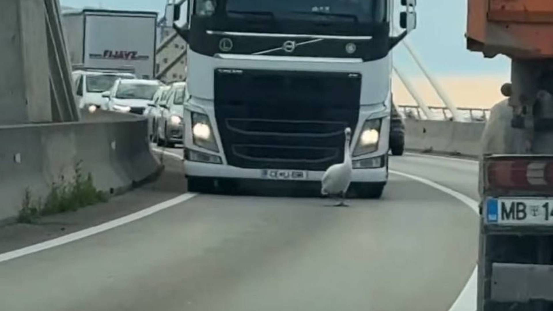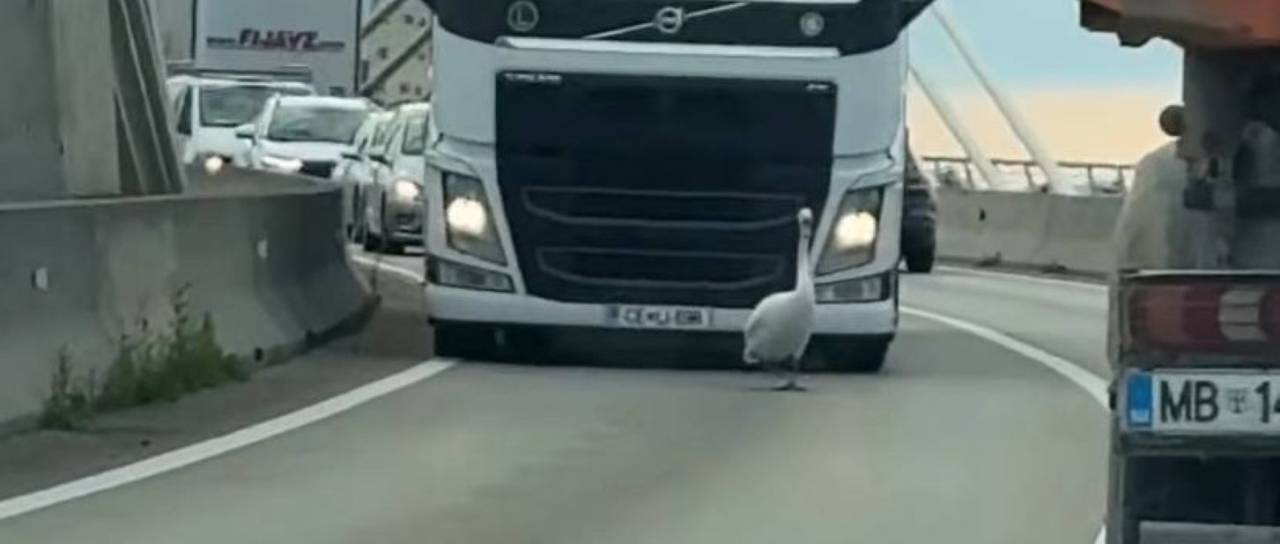 V ponedeljek dopoldne je na Puhovem mostu pri Ptuju promet za nekaj minut povsem obstal – razlog pa tokrat ni bila nesreča ali dela na cesti, temveč lep bel labod, ki se je mirno sprehodil čez most.