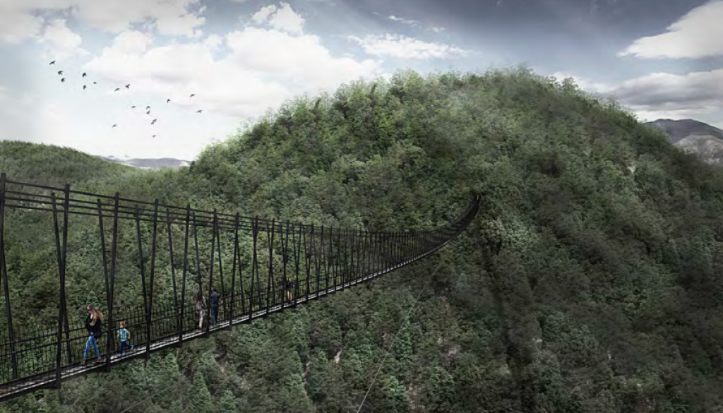 Idejni projekt a izgradnjo visečega mostu so že leta 2017 pripravili v sodelovanju s celjskim arhitektom Nandetom Korpnikom, pred kratkim pa so objavili javno naročilo za izdelavo projektne dokumentacije, ki še ni zaključeno. Po besedah arhitekta Korpnika bo gradnja 60 ton težke viseče konstrukcije precej zahtevna.