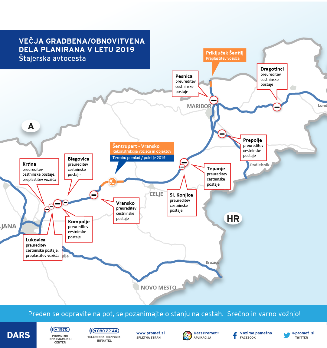 V družbi Družbi za avtoceste v Republiki Sloveniji načrtujejo, da bodo v okviru investicijskega obnavljanja vozišč letos obnovili odseke smernih vozišč avtocest in hitrih cest v skupni razdalji 49 kilometrov in dodatno še 12 kilometrov v okviru rekonstrukcije odsekov zaradi odstranitve preostalih cestninskih postaj in preureditve območij. Skupno torej 61 kilometrov smernih vozišč avtocest in hitrih cest.