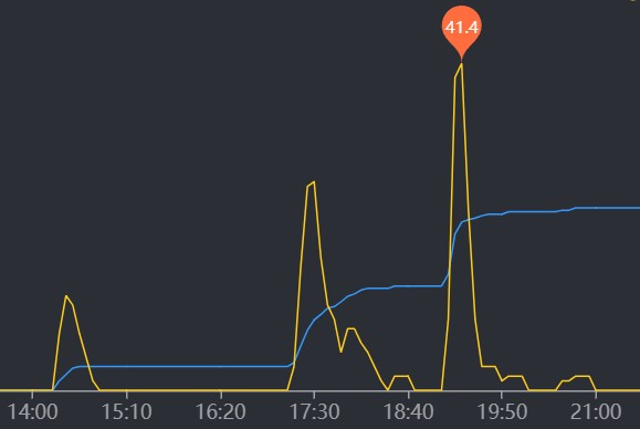 V tem času je prišlo še do maksimalnega naliva, ki se je zgodil ob 19.20, ko je v zelo kratkem času padlo kar 41,4 milimetrov na uro dežja, to je 0,7 milimetra v minuti (maksimum je označen z oblačkom).