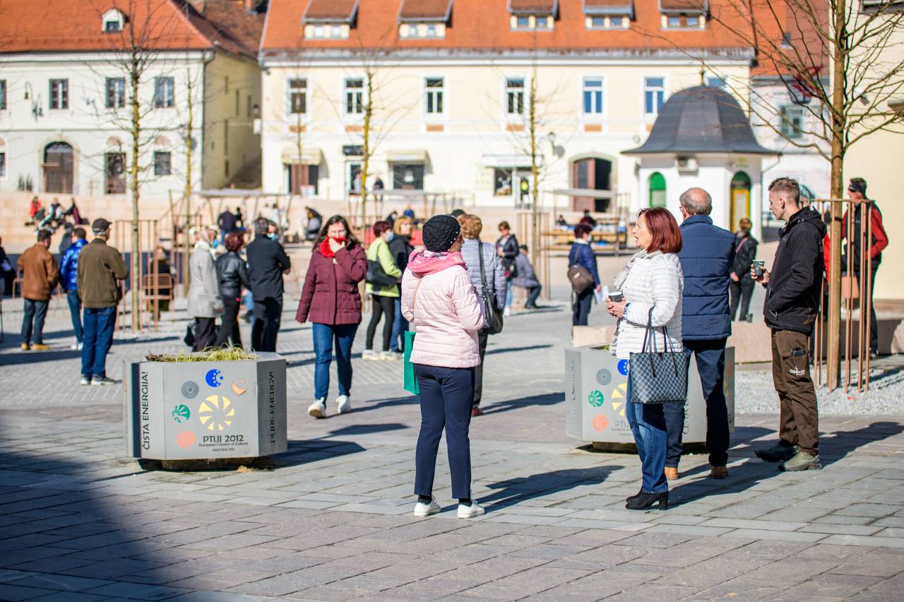Ptujčani so zasedli klopi na tržnici in ob kavi »to go« pokramljali drug z drugim, ali pa se le pogreli ob sončnih žarkih.