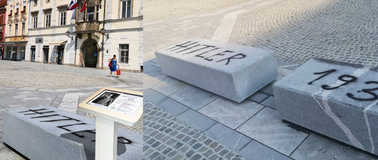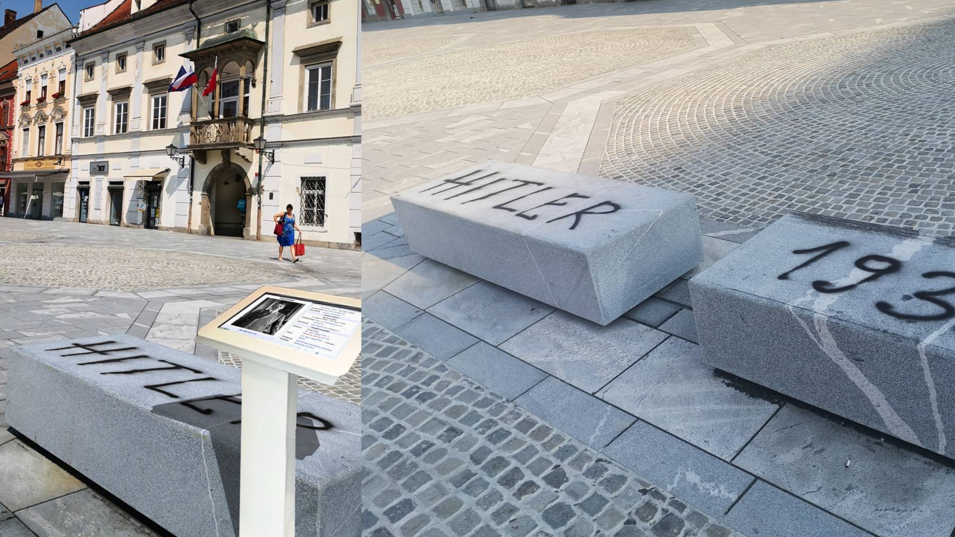 Napisi so se čez noč pojavili tudi na kamnitih klopeh na Glavnem trgu, kjer te dni zaključujejo celovito prenovo.