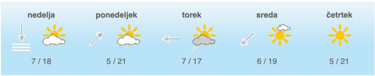 V severovzhodni Sloveniji bo pihal veter severnih smeri, na Primorskem dopoldne šibka burja. Najvišje dnevne temperature bodo od 15 do 19, na Primorskem do 22 stopinj Celzija.