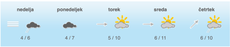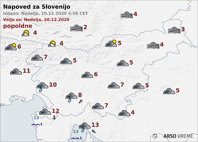 V zahodni Sloveniji lahko občasno rosi ali rahlo dežuje. Jutranje temperature bodo od -1 do 6, na Primorskem okoli 8, najvišje dnevne od 3 do 9, na Primorskem do 12 stopinj Celzija.