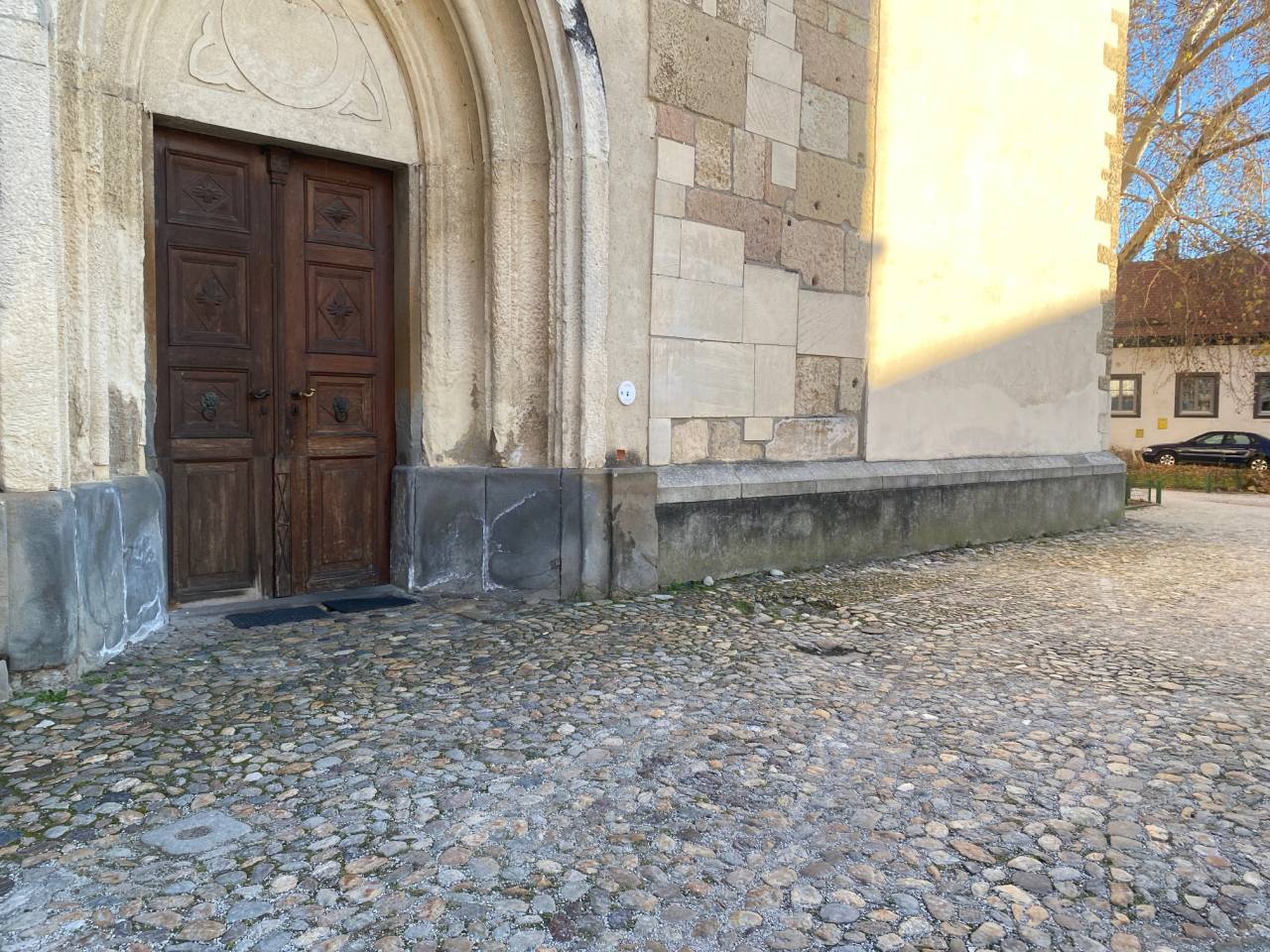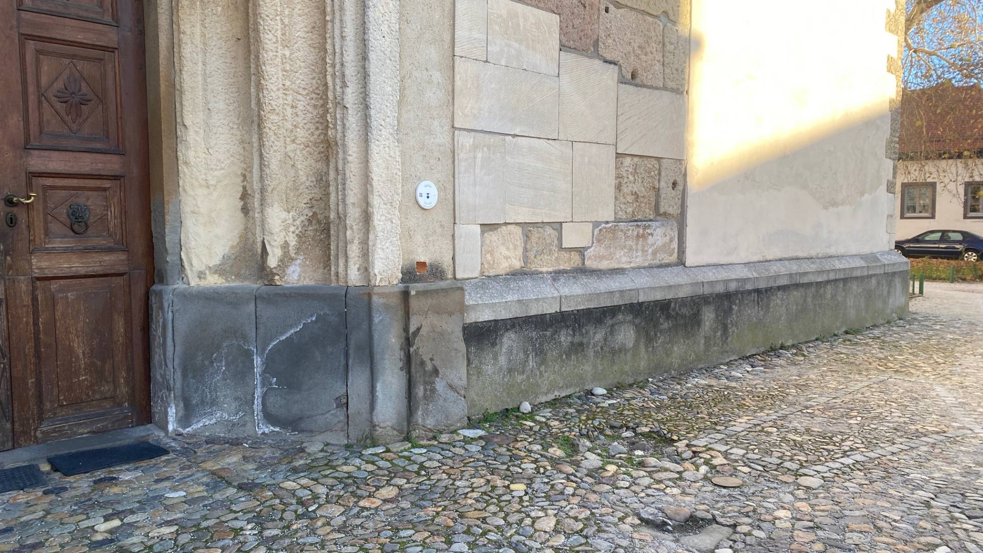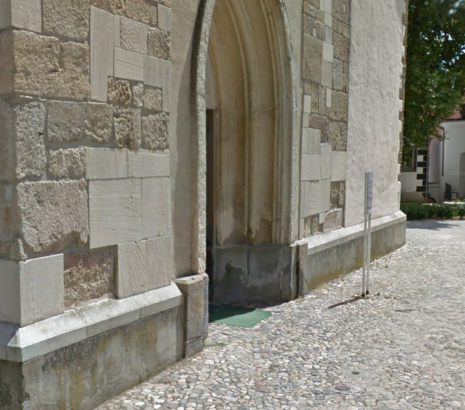 Pred vhodom v Cerkev svetega Jurija na Ptuju je do nedavnega stala tabla, zdaj je tam luknja, ki je lahko tudi nevarna.