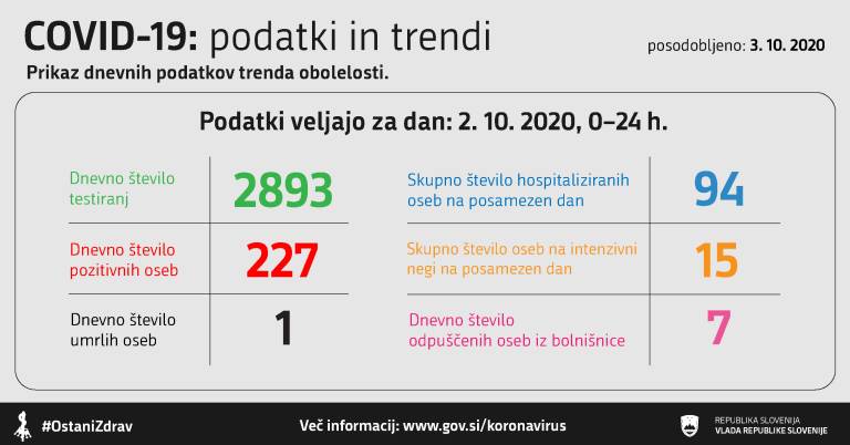 Včeraj, 2. oktobra 2020, so v Sloveniji opravili 2.893 testiranj na koronavirus. Potrdili so 227 novih okužb.