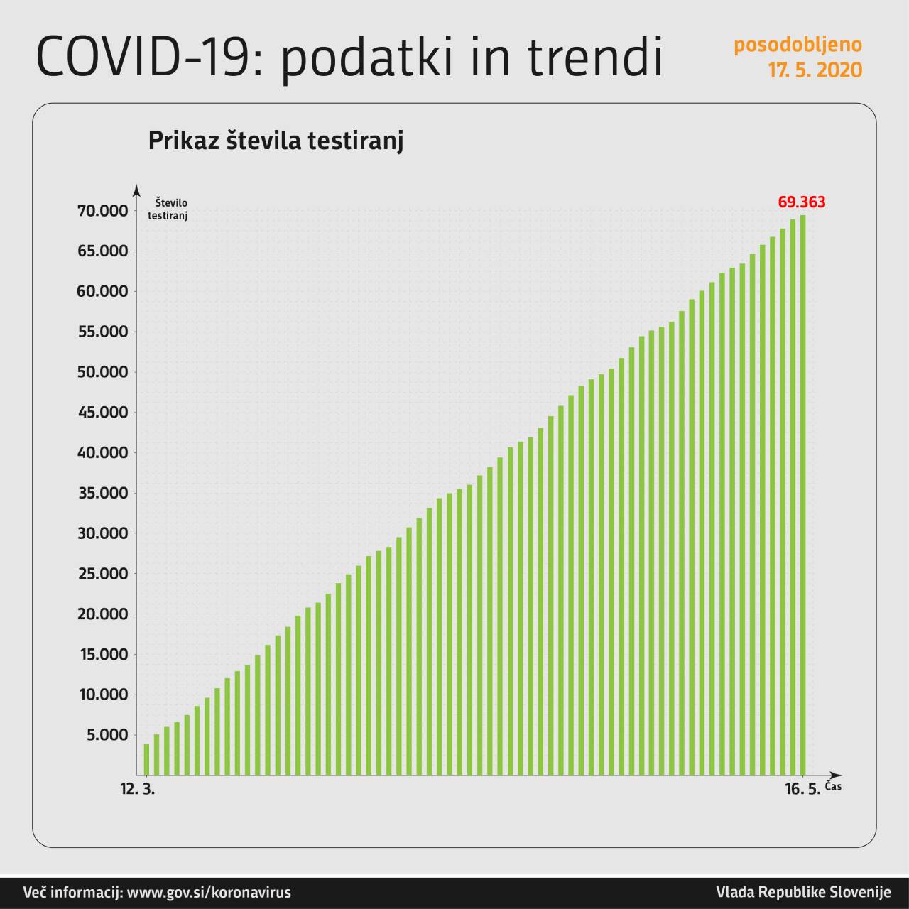 Včeraj, 16. maja, so v Sloveniji opravili 511 testov za covid-19, eden od njih pa je bil pozitiven. Skupno število okuženih je tako po novem 1.466.