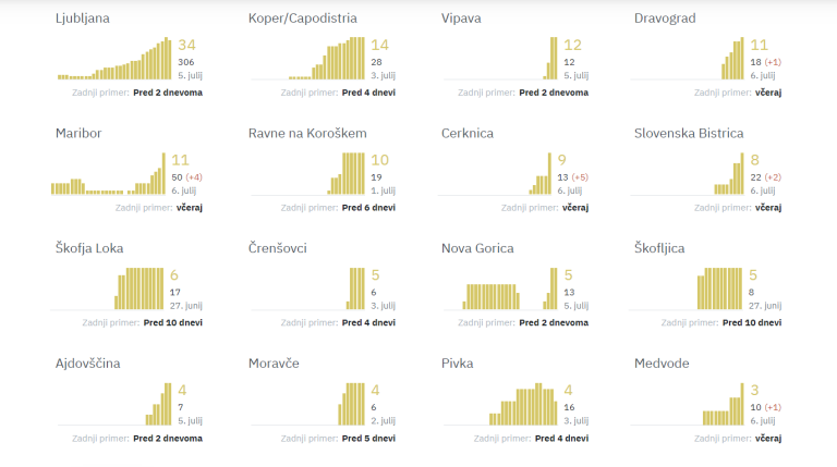 Okužbe so znova razpršene po celotni državi, pet so jih potrdili v Cerknici, štiri v Mariboru, po dve v Slovenski Bistrici, Postojni in Ilirski Bistrici, po eno pa v občinah Ribnica, Šempeter-Vrtojba, Renče-Vogrsko, Medvode, Mengeš, Trbovlje, Dravograd in Podvelka
