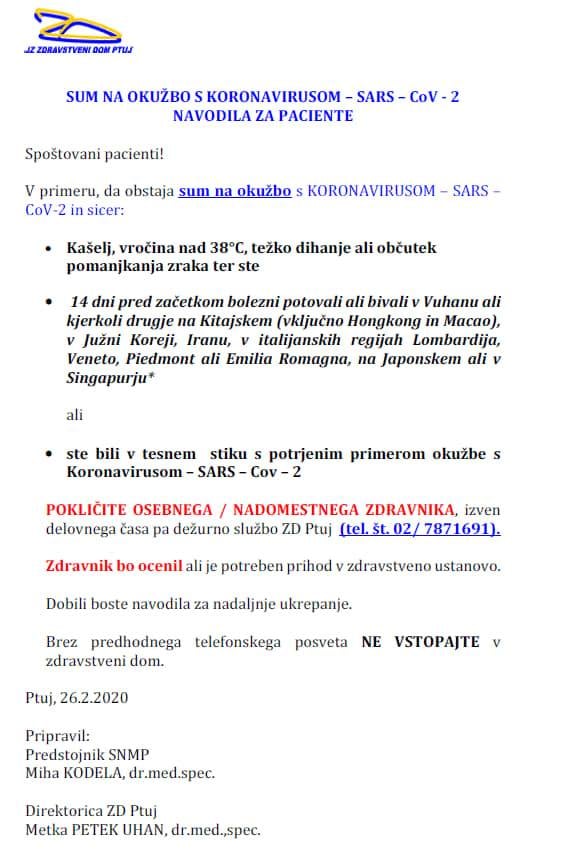 V Zdravstvenem domu Ptuj so včeraj objavili posebna navodila za paciente, ki sumijo, da bi lahko bili okuženi z novim koronavirusom.