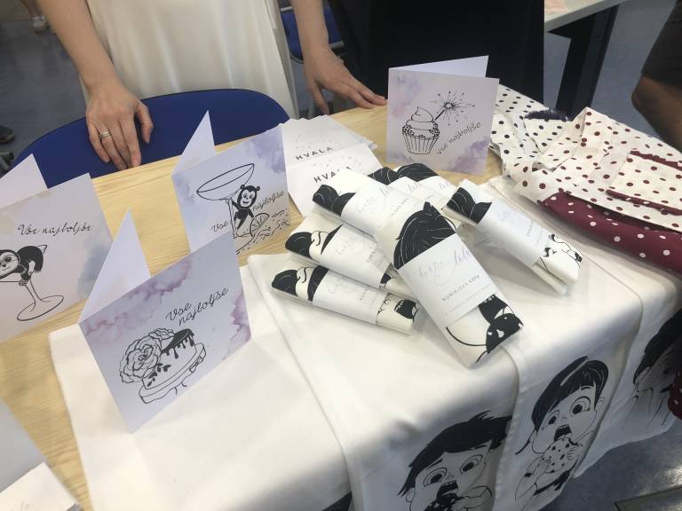Alenka Pahor pa se je usmerila v izdelavo unikatnega kuhinjskega tekstila: »Kuhinjski tekstil je namenjen predvsem mladim in tistim mladim po duši, z nekimi hudomušnimi ilustracijami.«