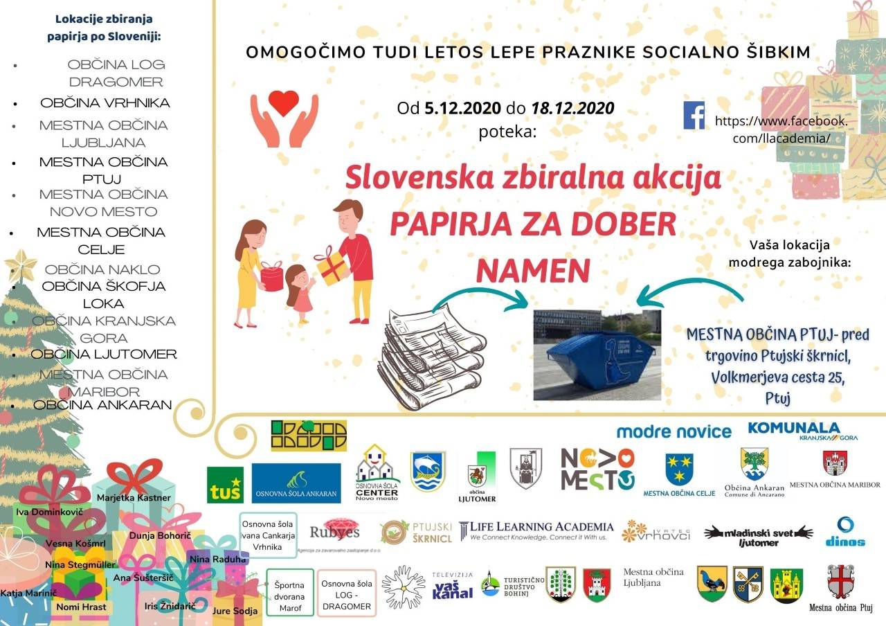 Da bi v teh izjemno zahtevnih časih socialno šibkim družinam omogočili čim lepše praznike, v Life Learning Academii organizirajo dobrodelno akcijo zbiranja starega papirja. Potekala bo po vsej Sloveniji, v 13 sodelujočih občinah.