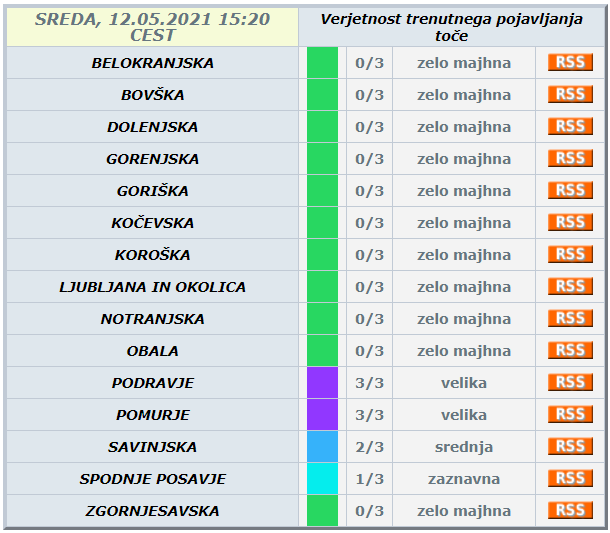 Agencija Republike Slovenije za okolje je že izdaja vijoličast alarm za verjetnost trenutnega pojavljanja toče na območju Podravja in Pomurja.