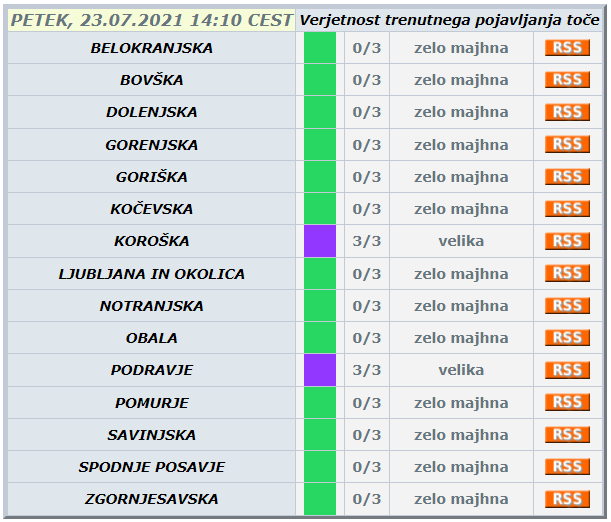 Agencija Republike Slovenije za okolje je že izdaja vijoličast alarm za verjetnost trenutnega pojavljanja toče na območju Podravja.