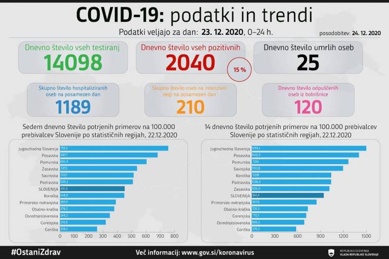 V Sloveniji so včeraj, 23. decembra, opravili 14098 testiranj na koronavirus in potrdili 2040 novih okužb. To pomeni, da je bil delež pozitivnih testov tokrat 14,5-odstoten.