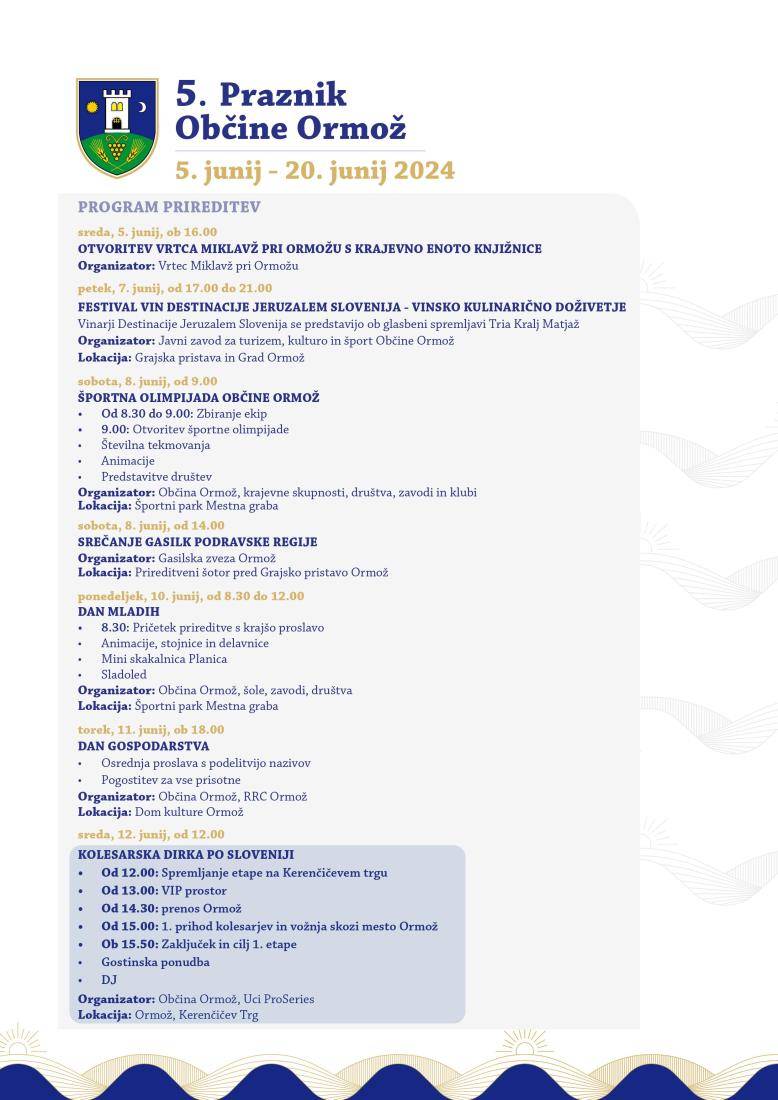 »Občina Ormož vas vabi v objem s svojimi turističnimi kmetijami, vinskimi kletmi, gostilnami, gostišči, apartmaji, počivališči za avtodome, kolesarskimi, jahalnimi, vodnimi in pešpotmi, naravnimi rezervati, krajinskimi parki in številnimi muzeji, cerkvami ter doživetji. Vabljeni, da se nam pridružite na praznovanju petega občinskega praznika,« so zapisali v povabilu.