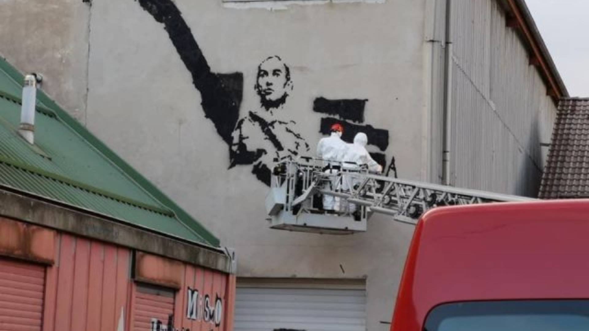 Pred mariborsko Pekarno je včeraj zvečer več policistov in gasilcev prišlo izbrisat grafit Janeza Janše.