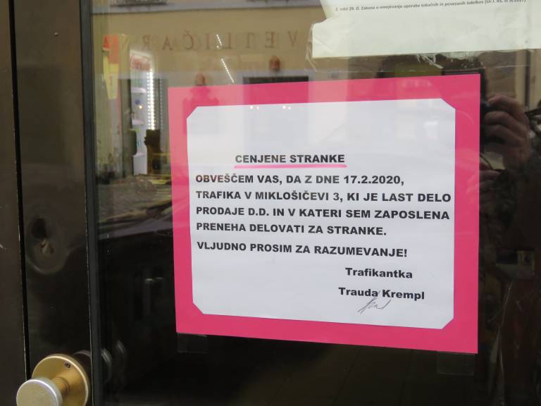 Možnosti, da bi se s franšizodajalcem uspela dogovoriti in nadaljevati večdesetletno tradicijo trafike na Miklošičevi ulici, trafikantka ne vidi več. V starem mestnem jedru tako ostaja odprta le še ena trafika, to je 3 dva v pritličju Mestne hiše.