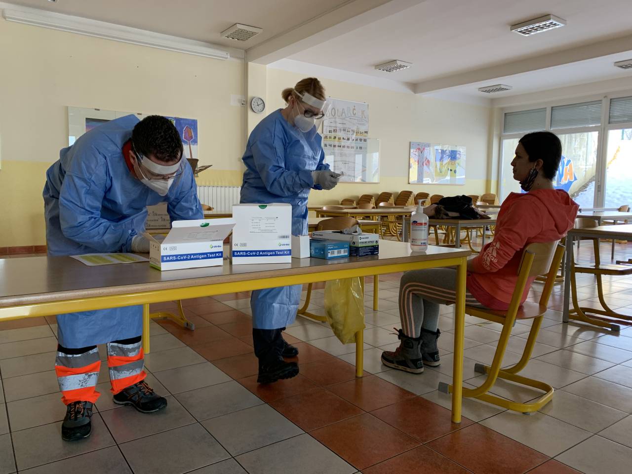 Na Osnovni šoli Voličina danes mobilna ekipa iz zdravstvenega doma Lenart ni testirala le tistih učiteljev, ki že po razredih poučujejo šolarje prve triade, temveč tudi nekaj zaposlenih, ki starejše otroke še vedno poučujejo na daljavo.