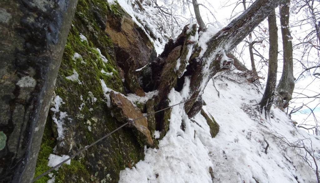 Le nekaj metrov pod vzhodnim vrhom, kjer je speljana zahtevna pot, je prišlo do podora. Trenutni podrto drevo in skale zadržuje jeklenica.