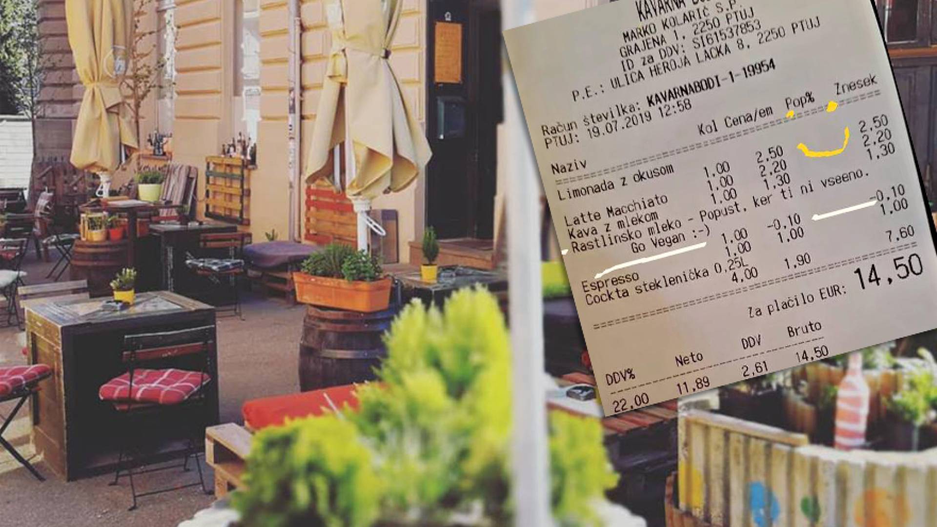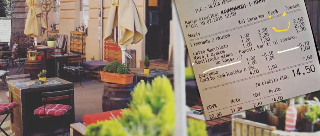 »Ko velik del gostincev, precenjeno zaračunava rastlinske napitke. Ko od nas vzamejo denar za kravje mleko (kar je vsaj meni sporno) in še po 50 ali več centov dodatka za rastlinsko, Kavarna Bodi izda tak račun.