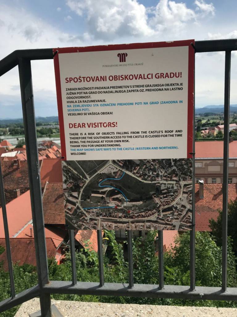 Letos februarja so ob južni poti na Ptujski grad postavili opozorilno tablo z napisom v slovenskem in angleškem jeziku: »Spoštovani obiskovalci gradu! Zaradi možnosti padanja predmetov s strehe grajskega objekta je južna pot na grad do nadaljnjega zaprta oziroma prehodna na lastno odgovornost. Hvala za razumevanje.«