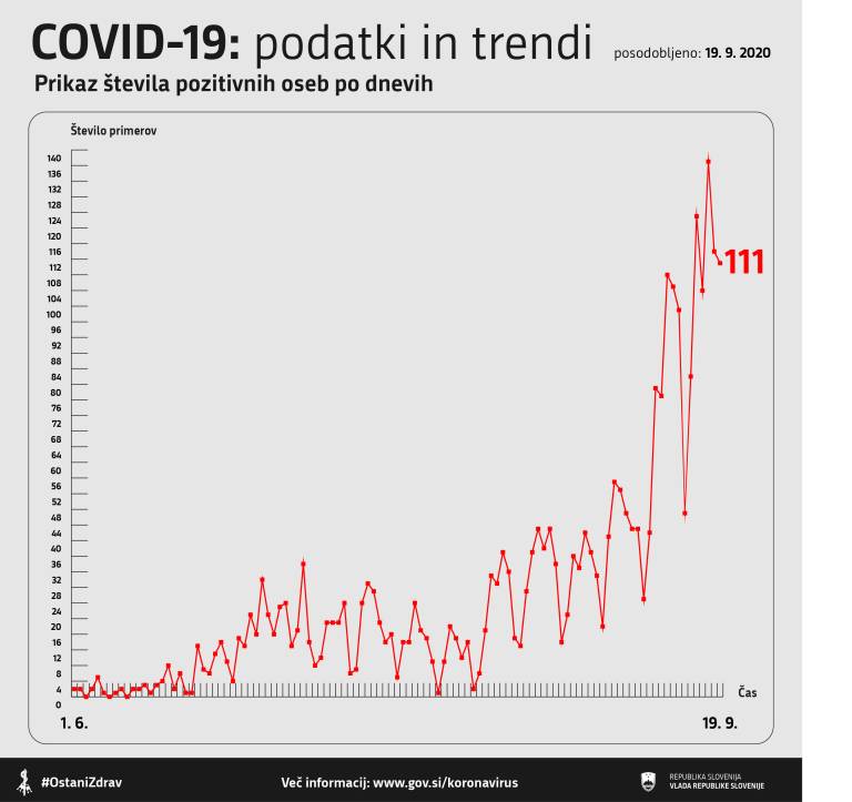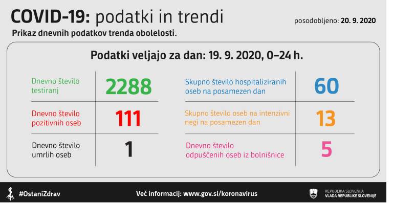 V Sloveniji so včeraj, 19. septembra 2020, opravili 2288 testiranj na novi koronavirus. Potrdili so 111 novih okužb. Za primerjavo: dan prej so ob 3070 testiranjih potrdili 114 novih okužb.