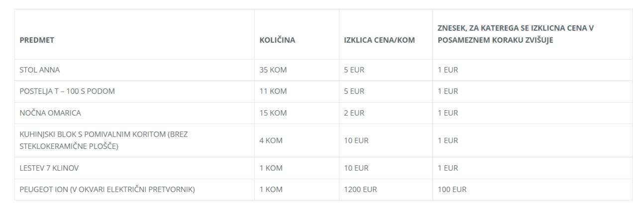 Posamezni predmet se prodaja po načelu videno – kupljeno in postane last kupca po plačanem računu. Izklicne cene so zapisane v spodnji tabeli.