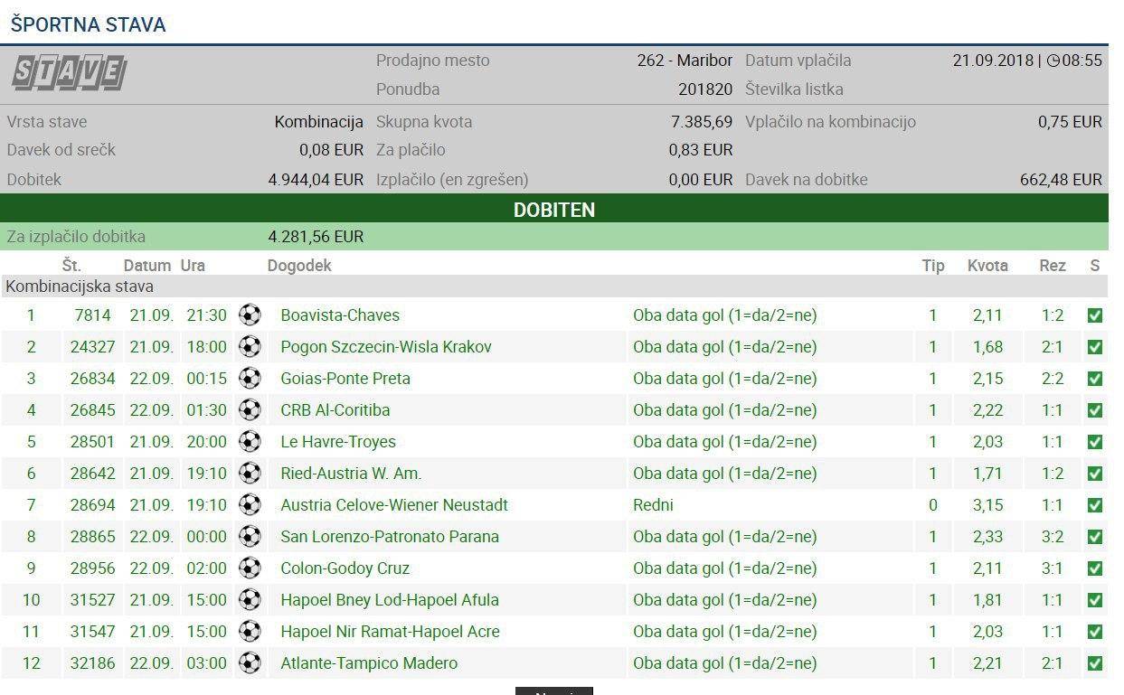 Kot je razvidno iz stavnega listka, je Mariborčan na 11 od 12 parov stavil, da bosta obe nogometni ekipi zabili gol, pri enem izmed parov pa je celo zadel končni rezultat.