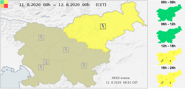 Za naše kraje so popoldan in zgodaj zvečer možni močnejši nalivi s točo, silovitimi piši vetra in udari strel. Hitro lahko narastejo hudourniški vodotoki.