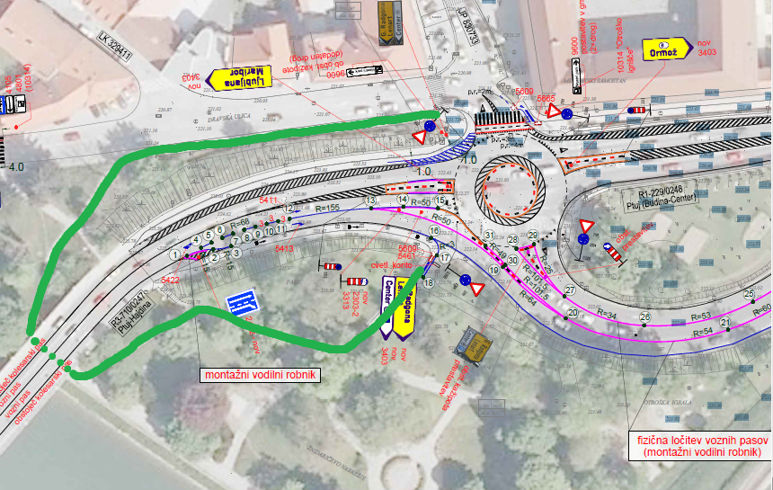 V sklopu preureditve se je v montažnem krožišču izbrisal prehod za pešce in kolesarje, vzpostavil pa se je obvozni pas. Na ta način imajo vozila iz smeri starega mosta direkten obvoz krožnega križišča.