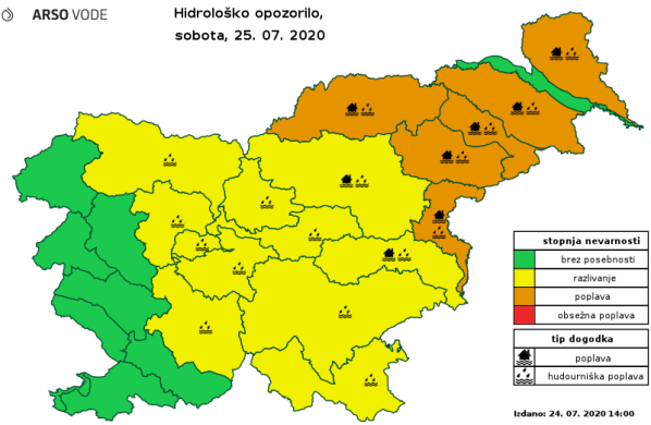 Zaradi napovedanih nalivov je po celotni Sloveniji povečana nevarnost pojavljanja zemeljskih plazov. Prav tako je zlasti v severovzhodni Sloveniji izdan oranžni alarm za poplavljanje rek.
